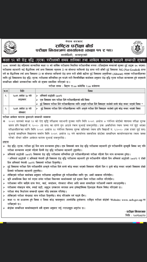 राष्ट्रिय परीक्षा बोर्डले कक्षा १२ को ग्रेडवृद्धि परीक्षाको समयतालिका प्रकाशन गरेको छ।