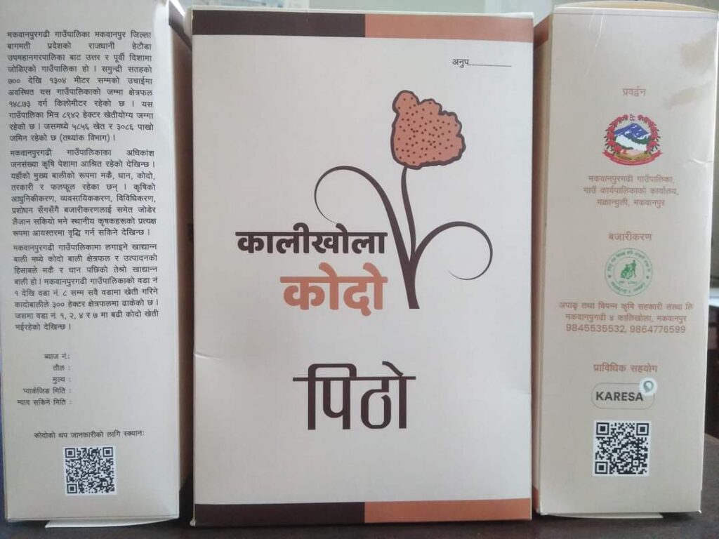मकवाापुरगढी गाउँपालिका कृषि विकास शाखाको सहयोगमा अपाङ्ग तथा विपन्न कृषि सहकारी संस्था लि. मकवानपुरगढी ४, कालिखोलाले रैथाने बाली प्रवर्द्वन कार्यक्रम अन्तर्गत बजारीकरण गर्ने गरि कालिखोला ब्रान्डको नाममा कोदोको दाना र पिठोको लेबलिङ र प्याकेजिङ्गको तयारी भईरहेको छ । भने ब्रान्डिङ, लेबलिङ र प्याकेजिङ्गको कार्यमा स्टोरी साइकलले प्राविधिक सहयोग गरिरहेको चौधरीले बताउनुभयो ।