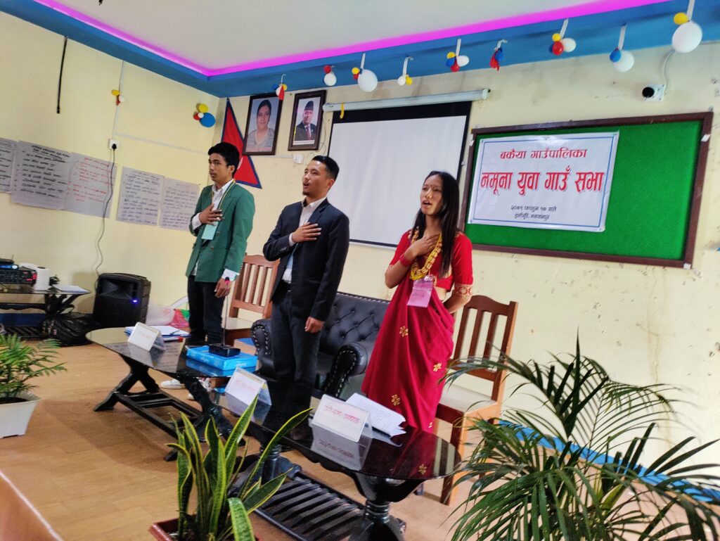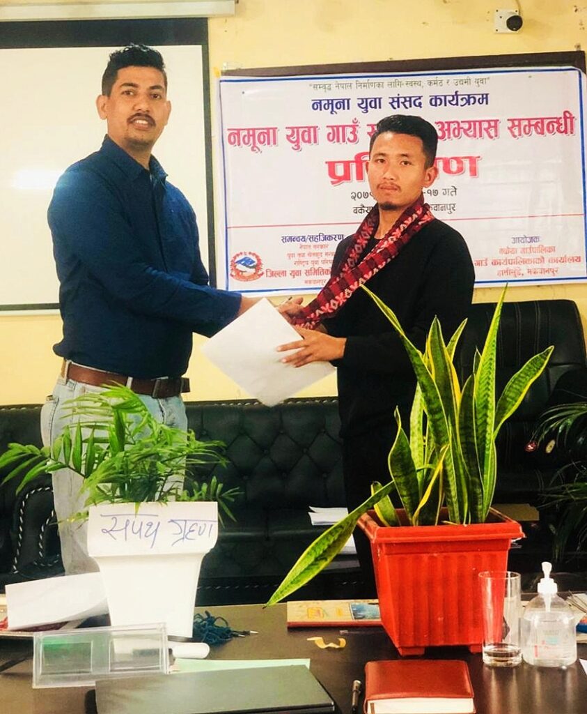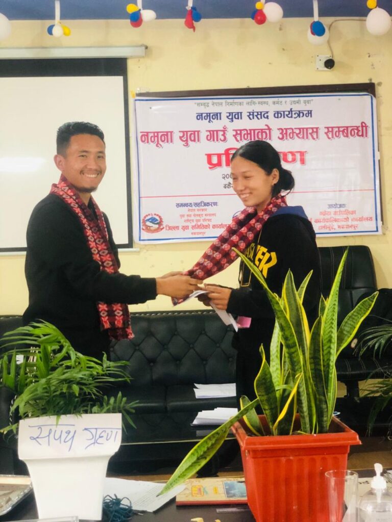 नमुना युवा गाउँसभाका अध्यक्ष, उपाध्यक्ष, गाउँसभा सचिब एवं सदस्यहरुलाई बुधबार जिल्ला युवा समितिका अध्यक्ष शिवहरि दाहालले पद तथा गोपनियताको सपथ ग्रहण गराउनुभएको थियो ।