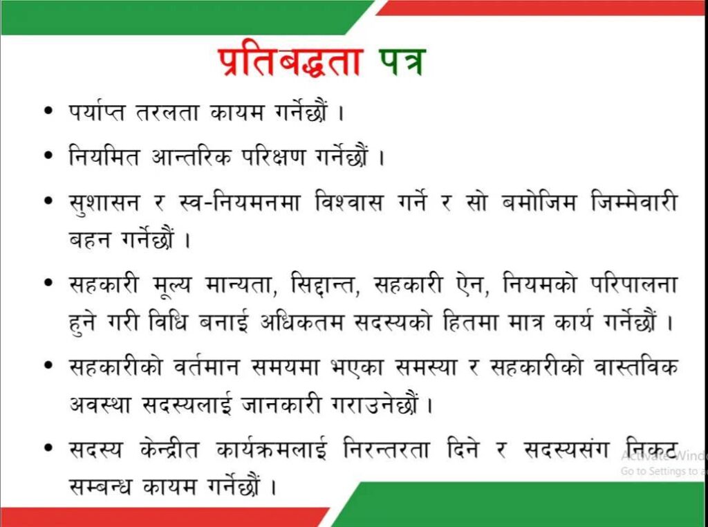 प्रतिबद्धता पत्रमा सहकारी संस्थामा आएको चुनौतीको सामूहिक रुपमा समाधान गर्न सदस्यहरुसंग निरन्तर सम्पर्कमा रहेर संस्थाको गतिबिधि संचालन गर्ने, संस्थामा पर्याप्त तरलता कायम राख्ने, सहकारी मूल्य, मान्यता, सिद्धान्त, सहकारी ऐन, नियमावलीको पूर्ण पालना गरी सदस्य हितमा कार्य गर्ने उल्लेख छ ।