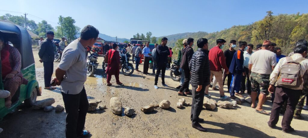 क्रसर उद्योगको लापरबाहीले बाटो खाल्डाखुल्डी भएको भन्दै स्थानीय द्वारा सिमलटारमा बाटो बन्द