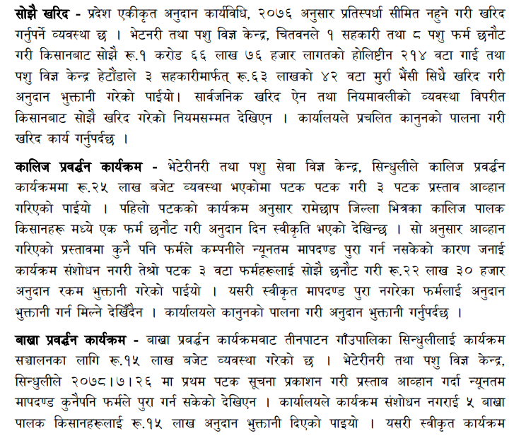 १० लाख रुपैयाँ भन्दा बडी रकमको पशु तथा चौपाया खरिद गर्नका लागि टेण्डर बाट मात्र खरिद गर्ने व्यवस्था रहेको छ । तर, बिना टेण्डर खरिद गरेको भनेर महालेखा परिक्षकको कार्यालयले पश्न गरेको छ । दुइ वटा कार्यालयले होलिस्टीन गाई र मुर्रा भैसी खरिद सोझै गरेको र कानून संगत नदेखिएको महालेखा परिषकको कार्यालयको प्रतिवेदनमा उल्लेख छ । बितेको आर्थिक वर्षमा गरिएको खरिदको काम कानून संगत नभएको हो ।
