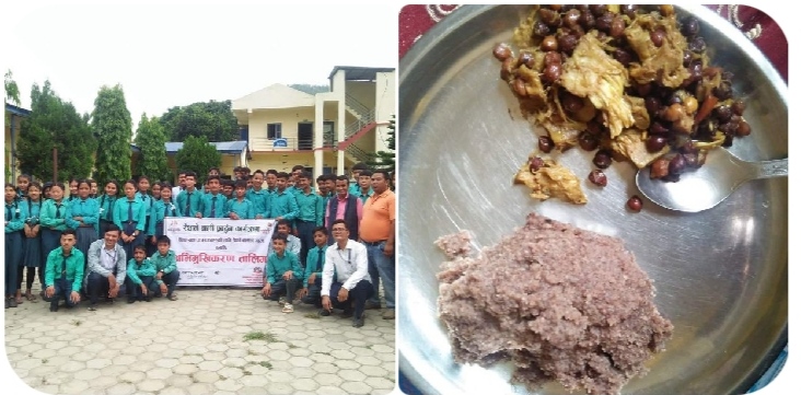 गाउँपालिकाको सामुदायिक विद्यालयहरुमा दिवाखाजामा हरेक विहिवार स्थानीय एवम् रैथाने खाजा खुवाउने प्रावधान बमोजिम बिहिवार कोदोको हलुवा र कटहर,चनाको तरकारी खुवाइएको गाउँपालिका कृषि शाखा प्रमुख चन्द्रकान्त चौधरीले बताउनुभयो ।
