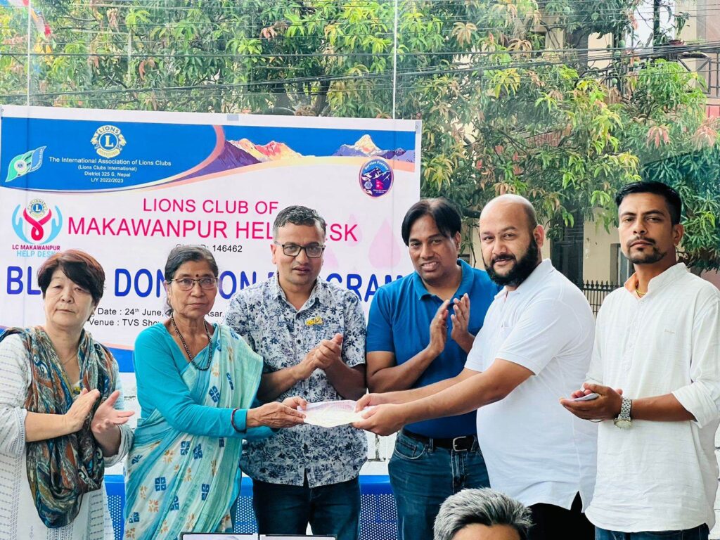 हेटौंडा,०९ असार/लायन्स क्लब अफ मकवानपुर हेल्प डेस्कको आयोजनामा टिभिएस सोरूम हेटौंडामा भएको रक्तदाम कार्यक्रमना ३१ जनाले रक्तदान गरेकाछन ।
