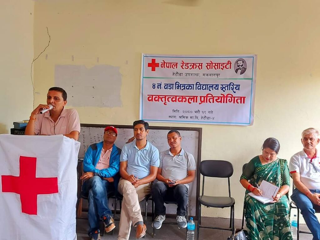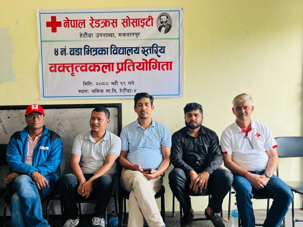 नेपाल रेडक्रस सोसाइटीको ६१ औ स्थापना दिवशको अबसरमा नेपाल रेडक्रस सोसाइटी हेटौंडा उपशाखाको आयोजनामा ४ नं वडाका बिधालय स्तरिय वक्तृत्वकला प्रतियोगिता श्रमिक माबी हेटौंडाको सभाहलमा सम्पन्न भएको छ ।