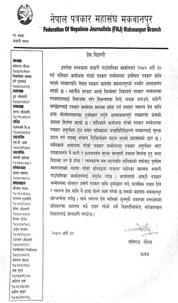 मनहरी गाउँपालिकाको कार्यालयले पत्रकार सम्मेलनमा पत्रकारहरुलाई निमन्त्रणा गरेर नियन्त्रणमा लिने, बन्धन बनाउने, बाहिरी मान्छेहरुलाई पत्रकार सम्मेलन स्थलमा प्रवेश गर्न लगाएर स्वतन्त्र प्रेस माथि धावा बोल्ने लगायतका दुव्र्यवहार गर्नाले मकवानपुरे पत्रकारमा त्रासको अवस्था सिर्जना भएको महासंघ मकवानपुरले विज्ञप्ती मार्फत जनाएको छ । पालिकाले आयोजना गरेको पत्रकार सम्मेलनमा पत्रकार नै असुरक्षित हुँदा समेत जनप्रतिनिधिहरुले पत्रकारलाई सुरक्षा प्रदान गर्न नसक्नु अत्यन्त गैरजिम्मेवार घटना भएको महासंघले दाबी गरेको छ ।