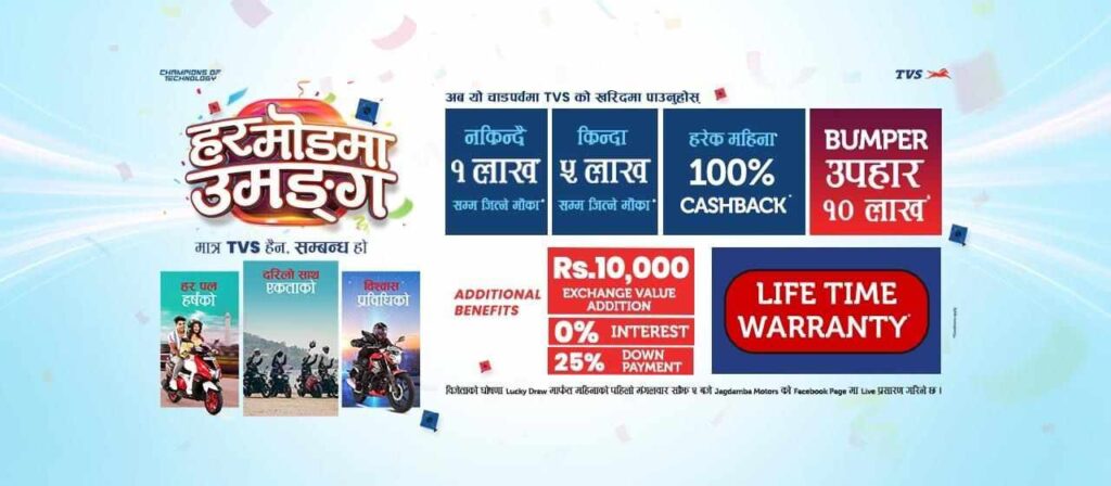 साथै ग्राहकले ‘हर मोडमा उमंग’ योजना अन्तरगत नकिन्दै १ लाख र किन्दा ५ लाखसम्म नगद छुट पाउन सक्ने टिभिएसले जनाएको छ ।टिभिएसका अनुसार हरेक महिना ग्राहकले लक्की ड्र मार्फत शत प्रतिशत रकम फिर्ता पाउन सक्नेछन् भने बम्पर उपहार अन्तरगत एकजानले १० लाख नगद पुरस्कार प्राप्त गर्नेछन् । यसै योजनामा न्युनतम २५ प्रतिसत डाउन पेमेन्ट र शुन्य प्रतिशत ब्याजदरको मासिक किस्ताबन्दी सुबिधामा मोटरसाईकल तथा स्कुटर खरिद गर्न सकिनेछ ।