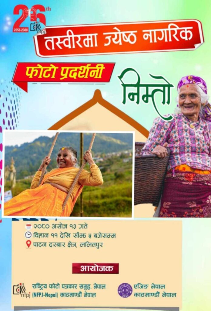 “सबै पुस्ताका लागि जेष्ठ नागरिकको मानव अधिकार बारे बिष्वब्यापी घोषणामा गरिएका बाचाहरु पुरा गरौं” भन्ने नाराका साथ राष्ट्रिय फोटोपत्रकार समूह र एजिङ नेपालको आयोजनामा नेपालका हिमाल पहाड र तराईका जेष्ठ नागरिकको तस्वीरहरु प्रदर्शनी गरिने आयोजकले बताएको छ ।