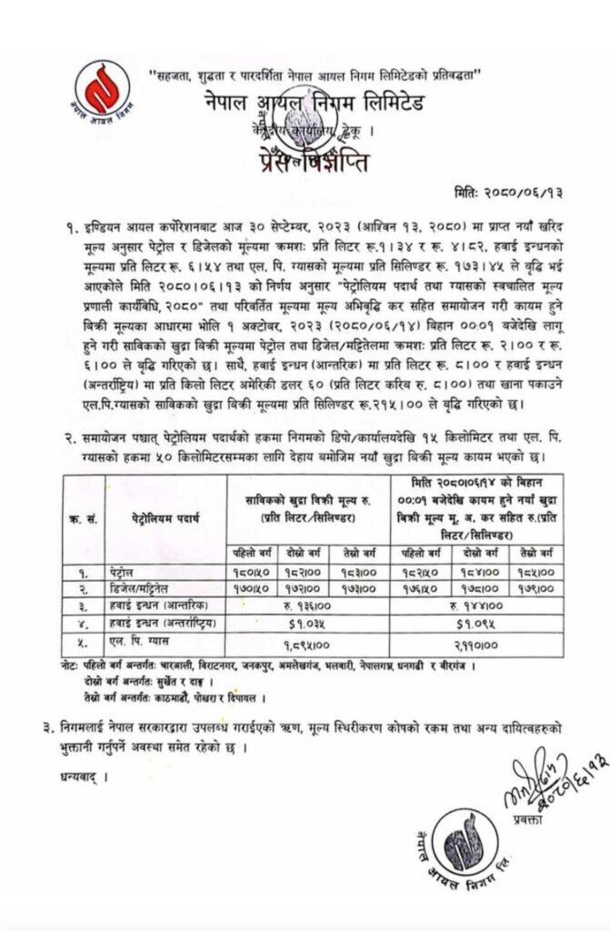 १४ असोज- सरकारले पेट्रोलियम पदार्थको मूल्यवृद्धि गरेको छ । शनिवार बसेको नेपाल आयल निगम सञ्चालक समितिको बैठकले पेट्रोलमा प्रतिलिटर दुई, डिजेल र मट्टितेलमा प्रतिलिटर छ रुपैयाँ र खाना पकाउने ग्यासमा प्रतिसिलिण्डर दुई सय १५ रुपैयाँ बढाउने निर्णय गरेको हो ।