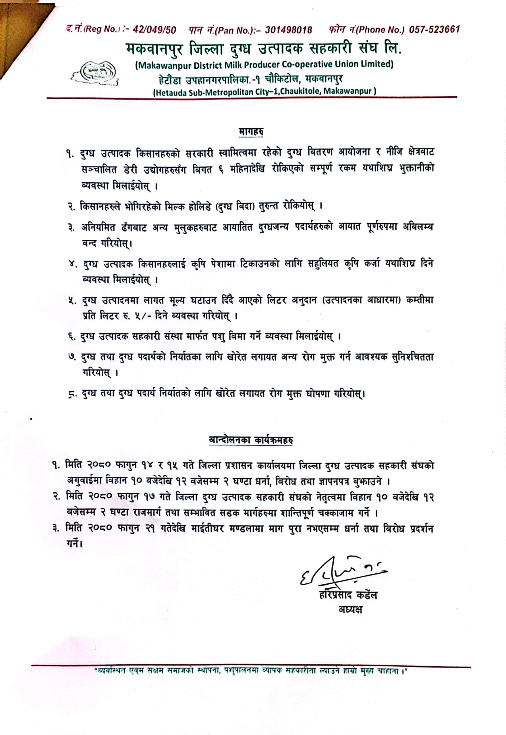 ‘कृषि र पशुपालन ब्यवशायमा यति धेरै समस्या सृजना हुँदापनि सरकार किसानहरुको समस्या प्रति उदासिन देखिनु, अबैधानिक रुपमा आयातित भारतिय दुग्ध र दुग्धजन्य पदार्थ रोक्न आवश्यक कदम नचाल्नु, आफ्नै मातहतमा रहेको दुग्ध विकास संस्थानलाई भुक्तानी दिनको लागि कुनैपनि कदम नचाल्नु जस्ता खेदजनक कदमको मकवानपुर जिल्ला दुग्ध उत्पादक सहकारी संघ घोर भत्र्सना गर्दछ’ ज्ञापनपत्रमा भनिएको छ ।