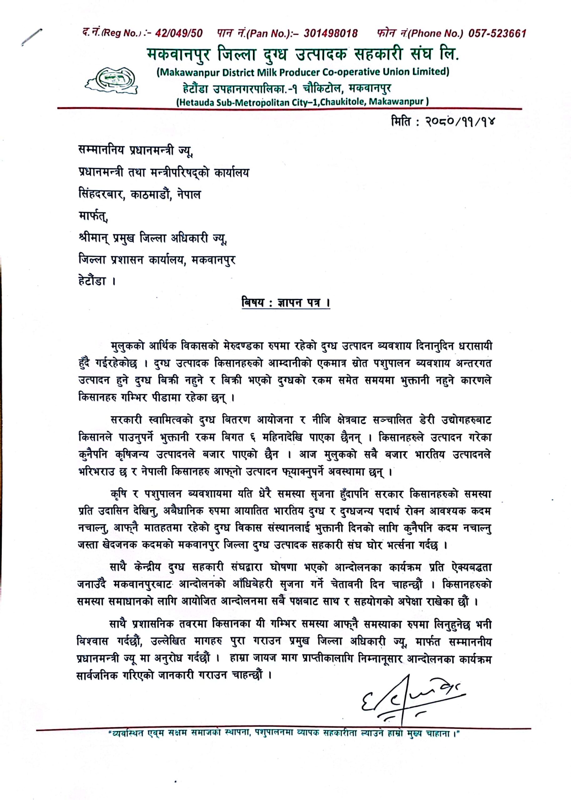 जिल्ला दुग्ध संघ मकवानपुरले प्रमुख जिल्ला अधिकारी मार्फत बुझायो प्रधानमन्त्रीलाई ज्ञापनपत्र